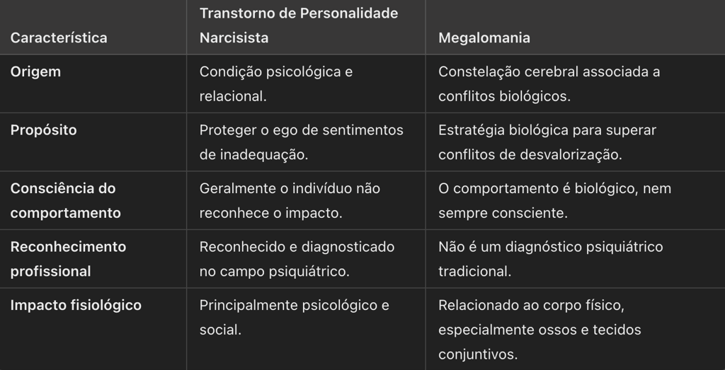 Tanto no narcisismo quanto na megalomania, os indivíduos podem exibir comportamentos de exaltação pessoal. Porém, enquanto na psiquiatria a grandiosidade é mais relacionada à proteção contra a insegurança, na Medicina Germânica ela é uma compensação biológica mais enraizada, com significado mais profundo.Necessidade de controle e reconhecimento: