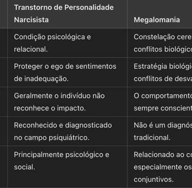 Na NMG, entende-se que as manifestações comportamentais, tanto no narcisismo quanto na megalomania, têm raízes em conflitos internos profundos, muitas vezes inconscientes. Aqui está como essas condições são abordadas: